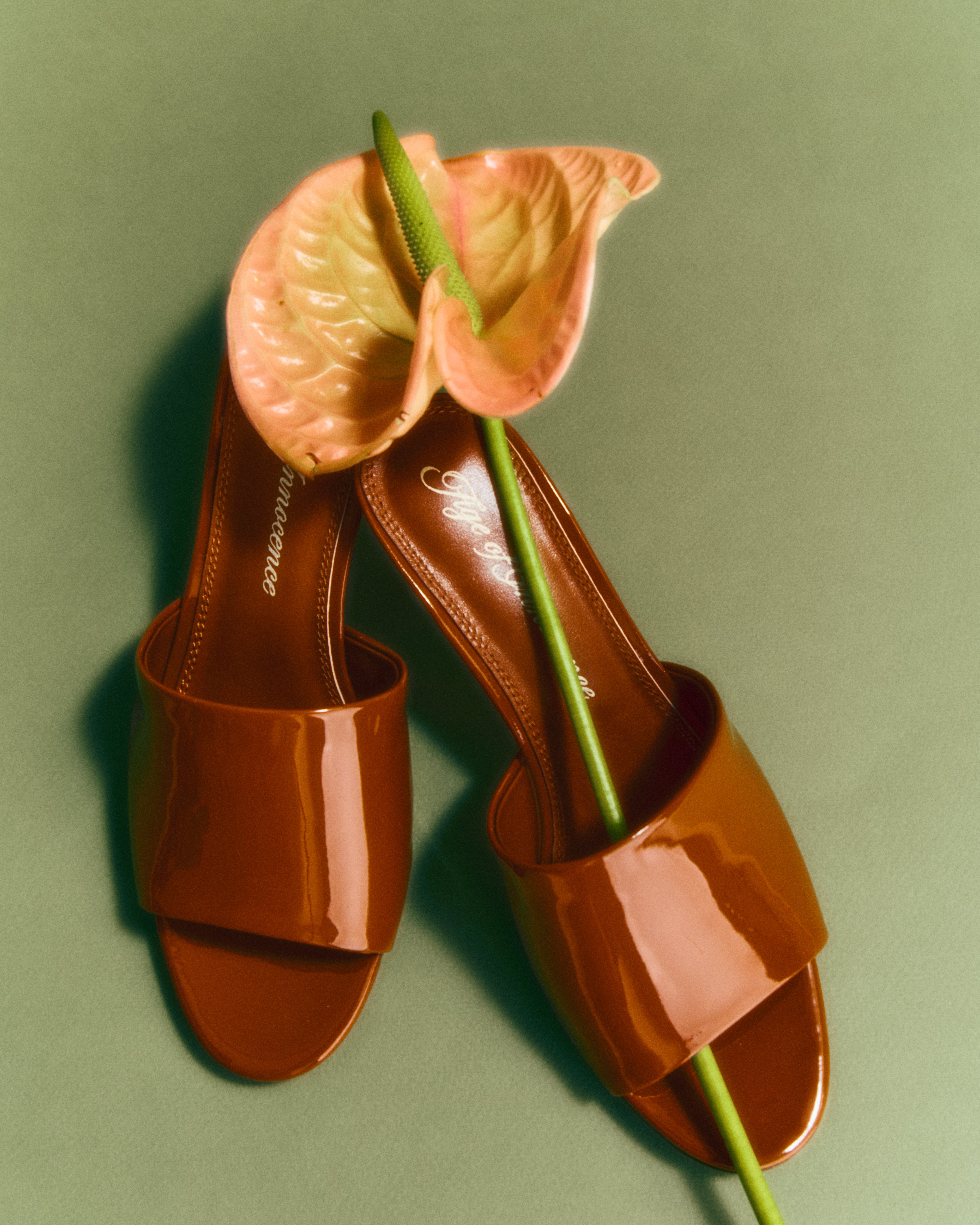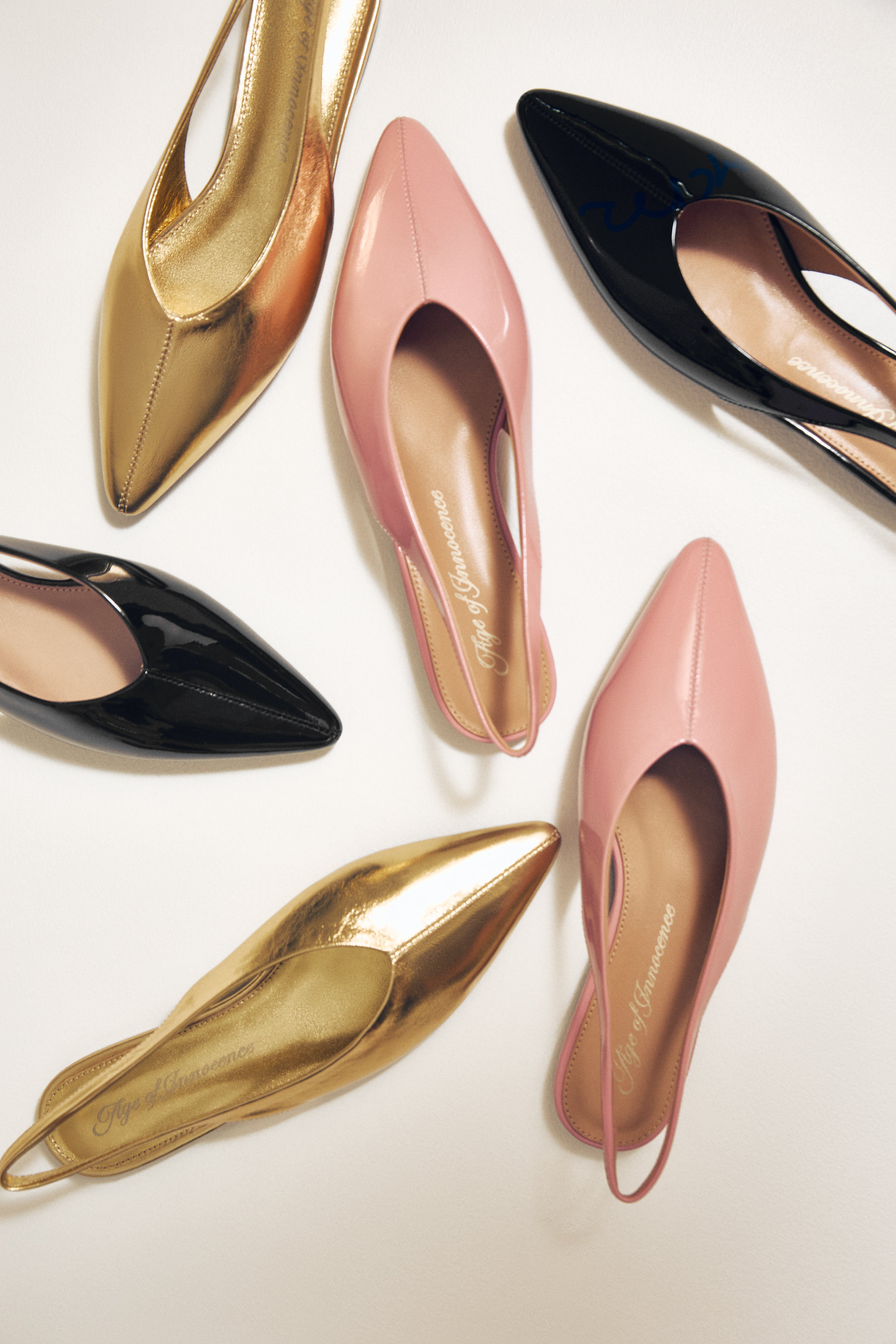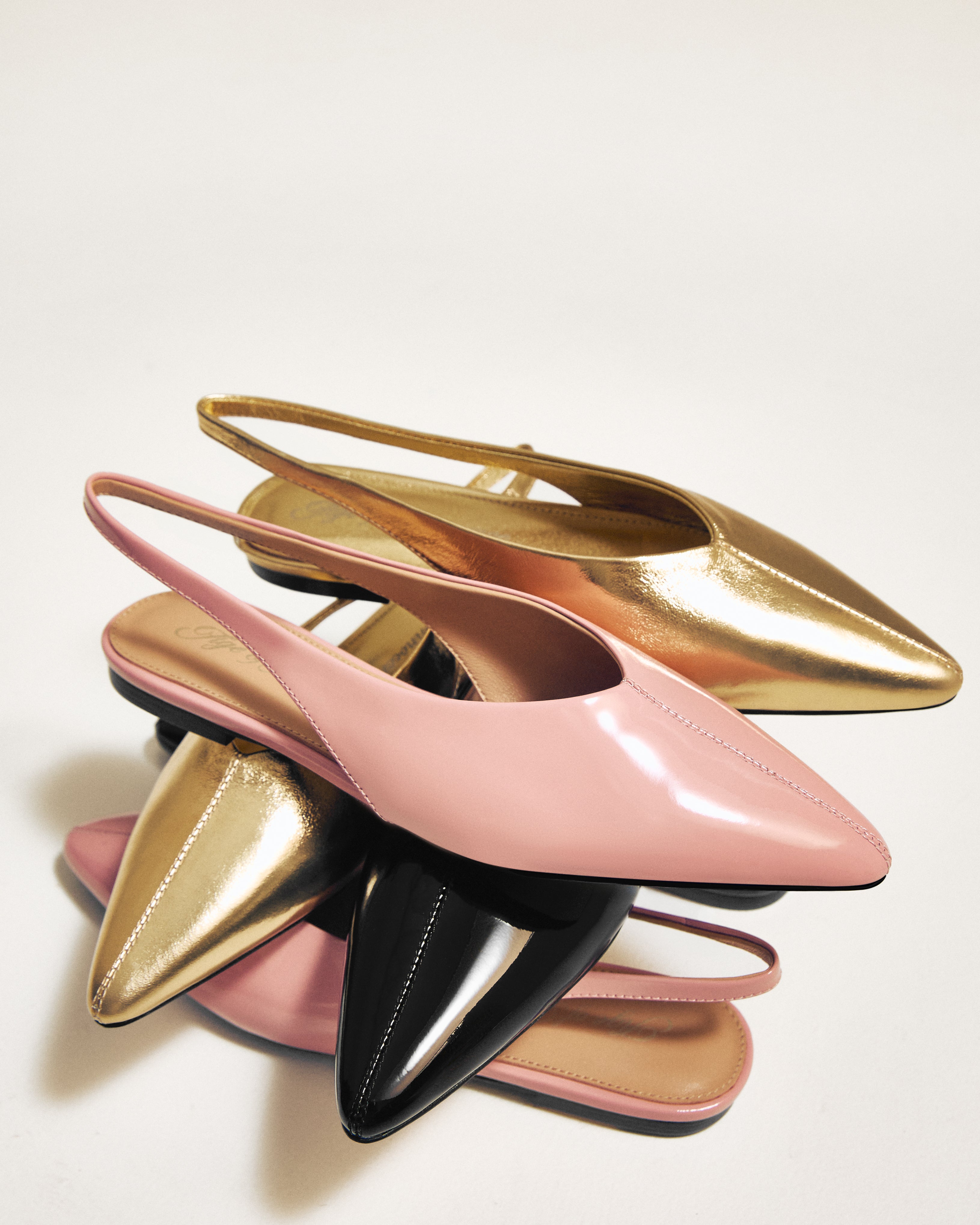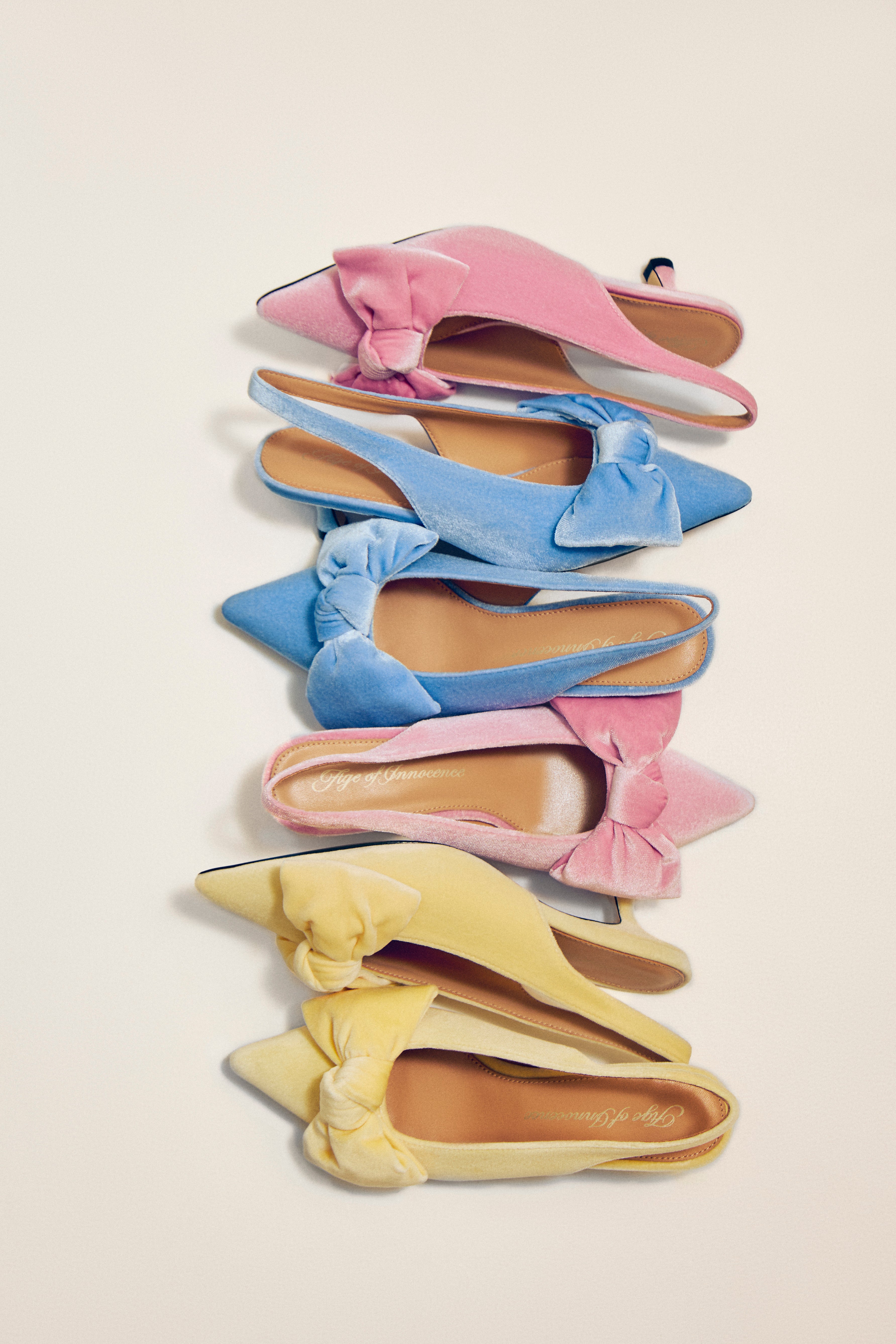 Мюли на каблуке и без, балетки на плоской подошве с зауженным носом и минималистичные босоножки, элегантные лодочки и бархатные слингбэки — коллекция получилась яркой во всех смыслах.
