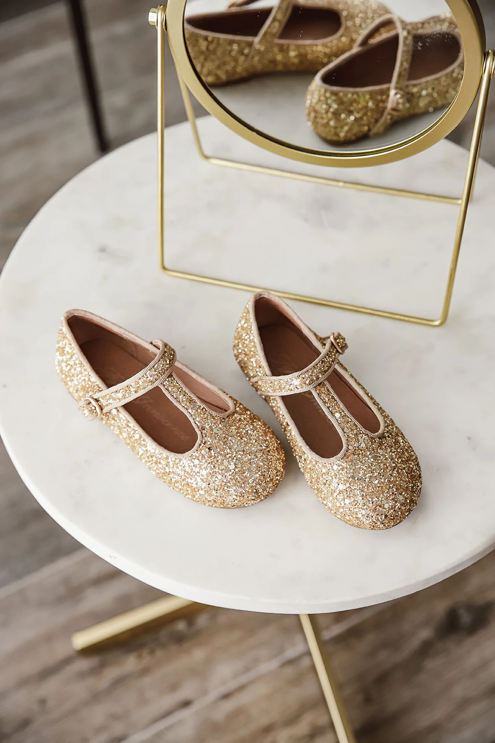 Мы знаем, что маленькие девочки обожают сверкающий глиттер и туфельки, от которых нельзя оторвать глаз. Модель Abigail в золотом глиттере смотрится просто восхитительно. При этом ее внутренняя часть выполнена из мягкой натуральной кожи. Не бойтесь сочетать глиттер с денимом и усиливайте его эффект за счет бархата!