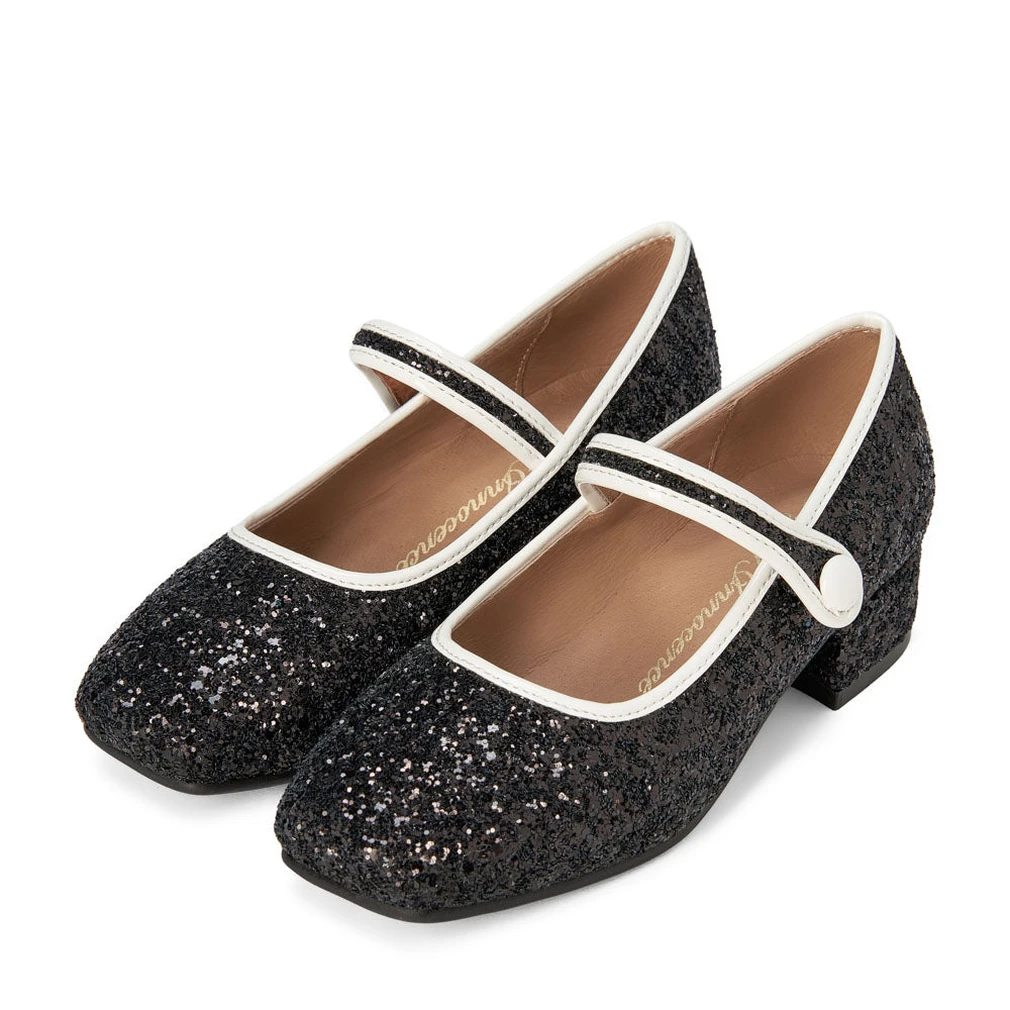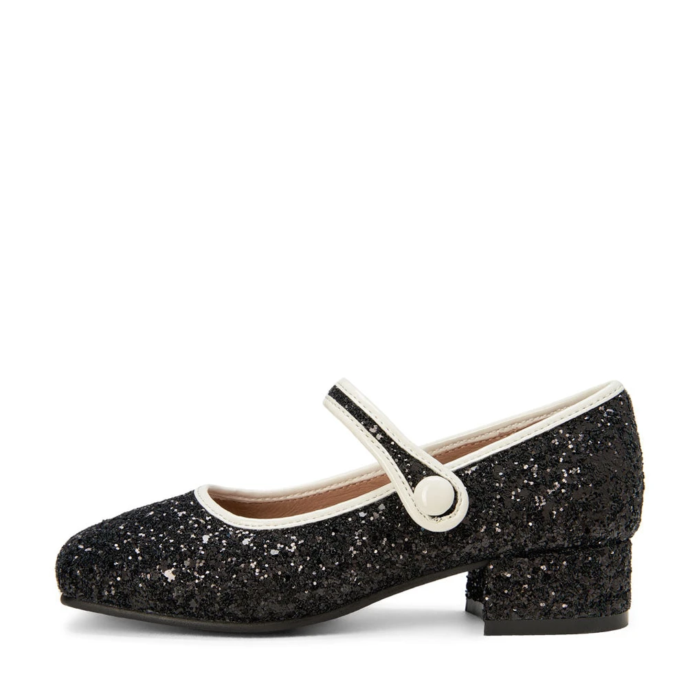 В этих туфельках есть абсолютно все, чтобы мы с полной уверенностью смогли отнести их к стилю "гламурный шик". Кожаные внутри и покрытые чёрным и серебряным глитером снаружи, на каблучке, с квадратным носиком и ремешком аля Mary Jane они кажутся почти игрушечными. Особенную прелесть этой модели придает контрастный кожаный кант. Даже не знаем, хватит ли у вас силы воли запирать их в шкафу в будние дни.
