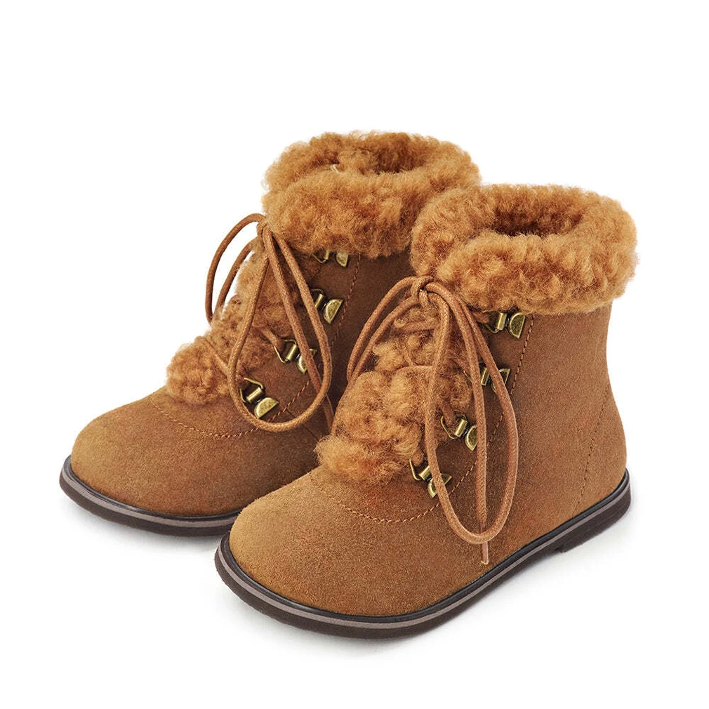 Модель выполнена из коричневой натуральной замши и имеет подкладку из 100% натуральной овчины. Мех подкладки мягкий, очень теплый и имеет красивую фактуру. Ботиночки декорированы шнуровкой, которая позволяет удобно и плотно зафиксировать обувь на ножке. Они будут хорошо смотреться с теплой дубленкой с меховым воротником, пуховиком или зимней паркой. В модели Amy будет уютно гулять и по зимним парковым дорожкам, и по заснеженным горным склонам.