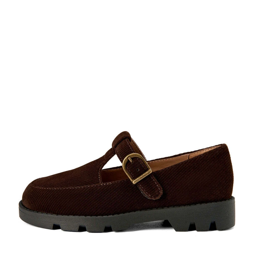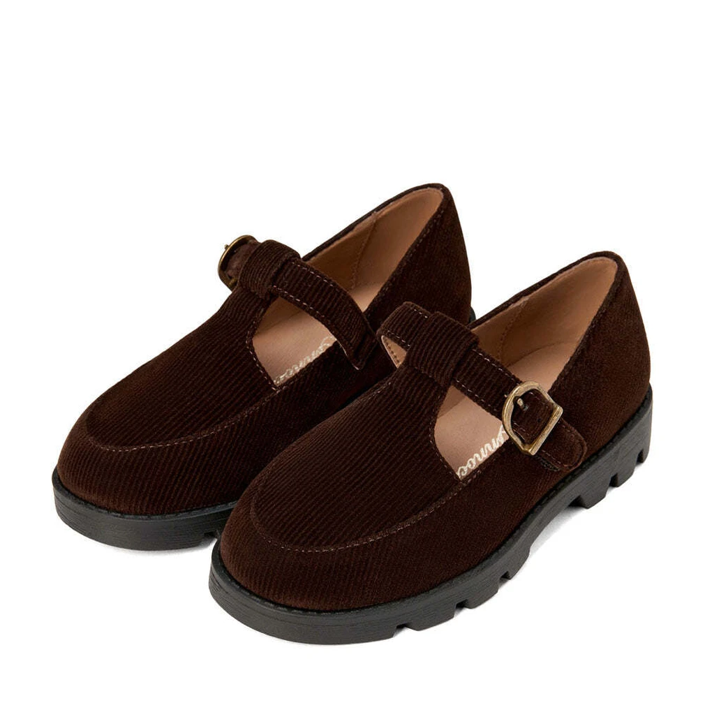 Туфли на толстой подошве с протектором с Т-образной застежкой-ремешком велькро — абсолютный хит наших школьных коллекций на протяжении уже нескольких сезонов. В этот раз мы решили внести разнообразие в уже знакомый силуэт при помощи вельвета синего, бордового, коричневого или зеленого цвета. При этом внутренняя часть туфель осталась кожаной. Одежду к такой обуви можно подобрать практически любую: абсолютно органично будет смотреться как юбка с крупной плиссировкой, так и прямые широкие брюки.