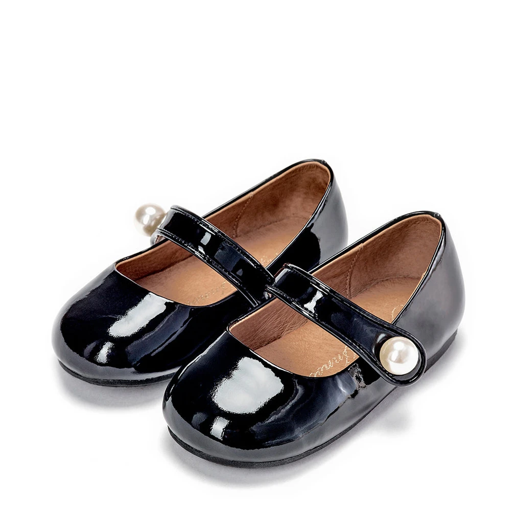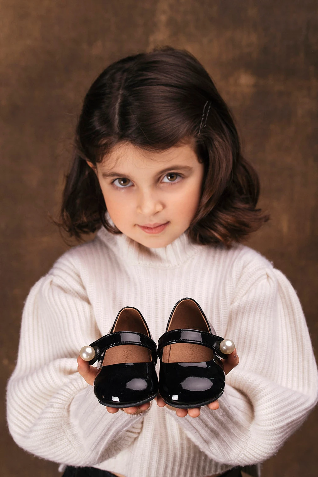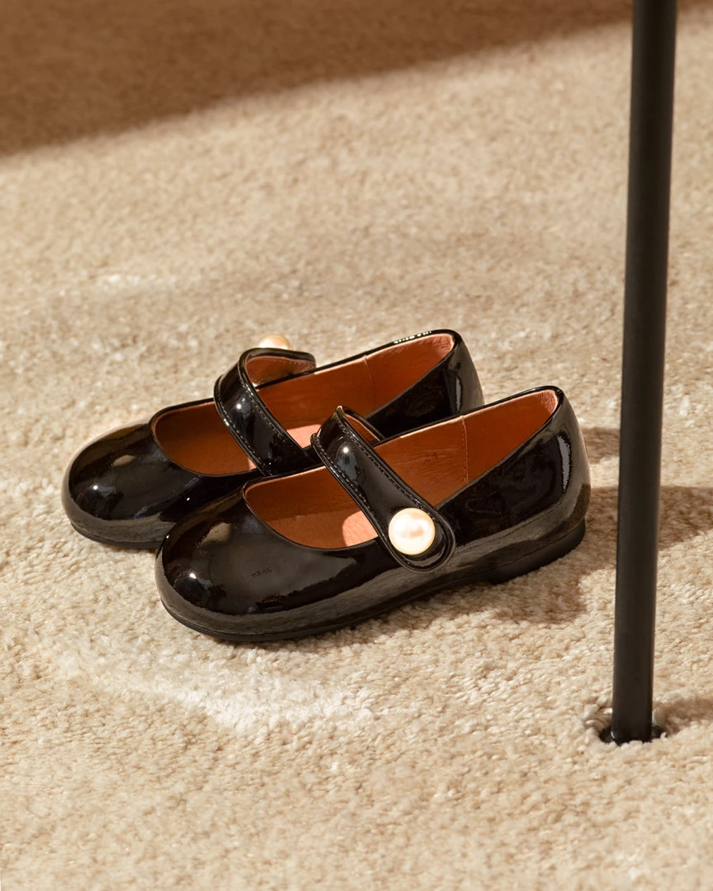 Классические лакированные туфельки «на все случаи жизни», украшенные эффектной крупной жемчужиной. У этой модели нет застежки, под ремешком скрыта эластичная резинка, благодаря которой их легко надевать и снимать. Эта идеальная обувь для школы и походов в театр. Ее можно сочетать с платьями и блузками из легкого шелка и пиджаков из бархата.