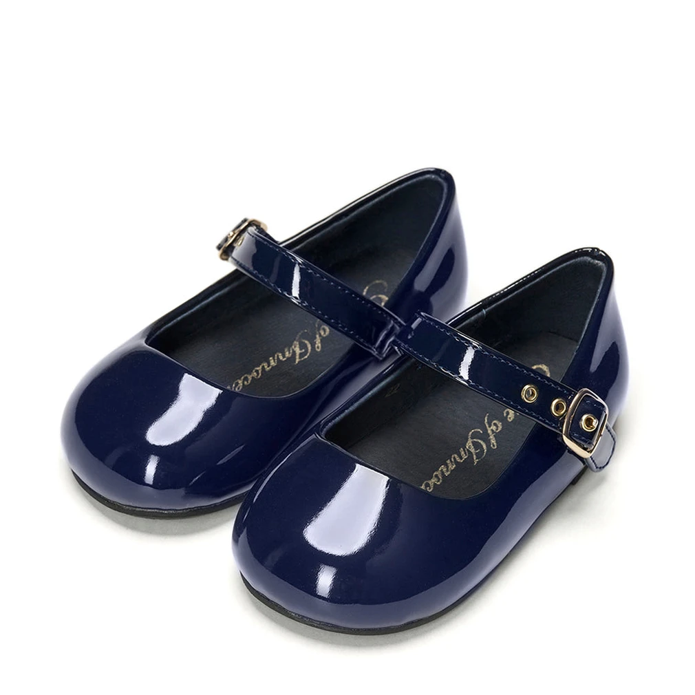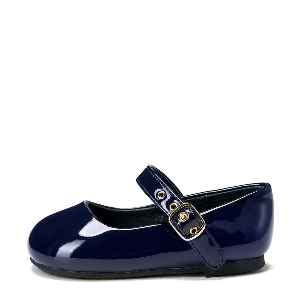 Лакированные темно-синие туфельки Eva идеальны для праздника или вечернего выхода. Декорированные лишь минималистичной золотой пряжкой они будут хорошо смотреться как с нарядным платьем, так и со школьной формой или укороченными джинcами.