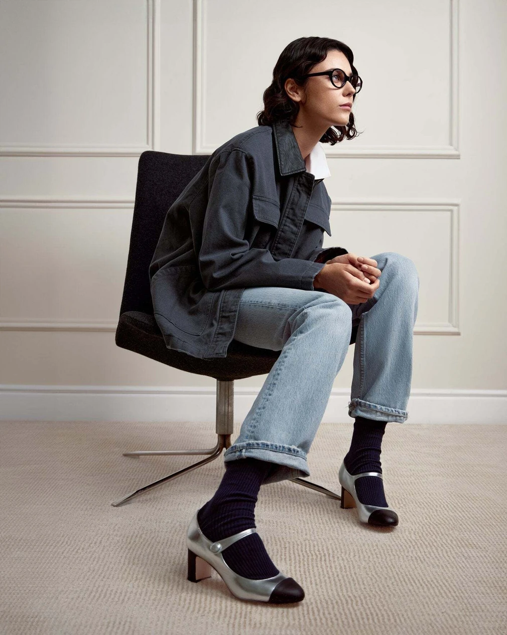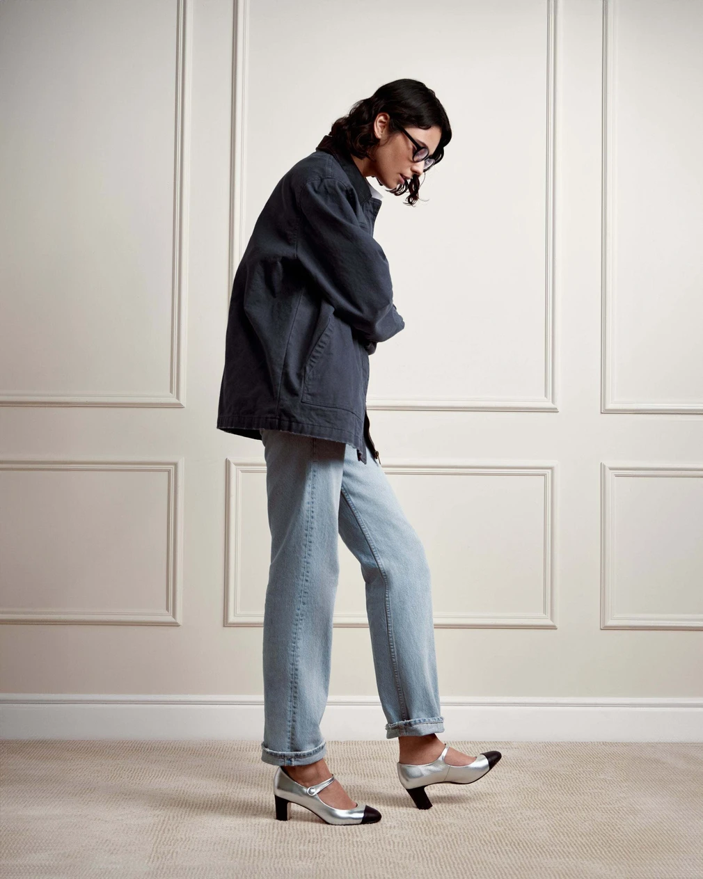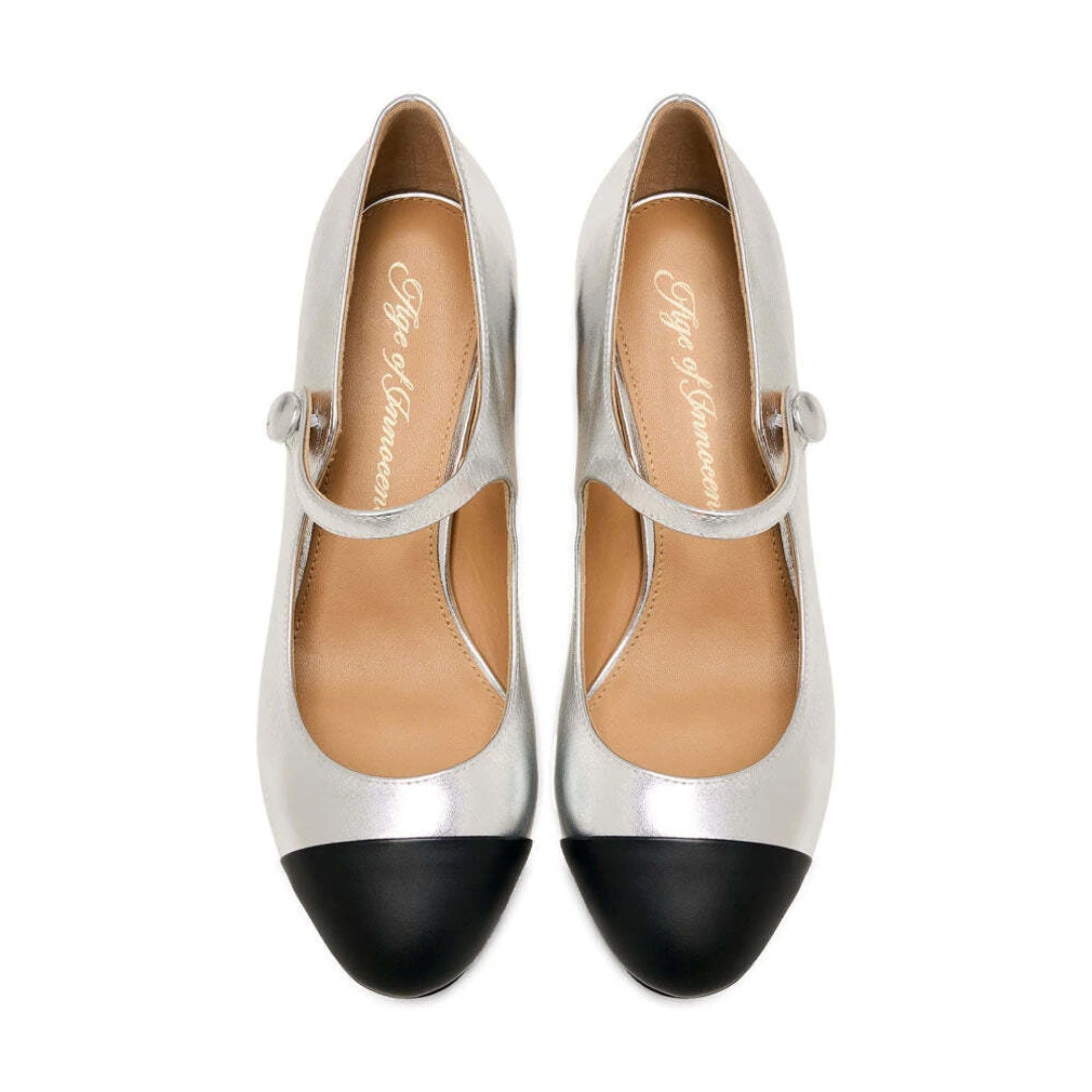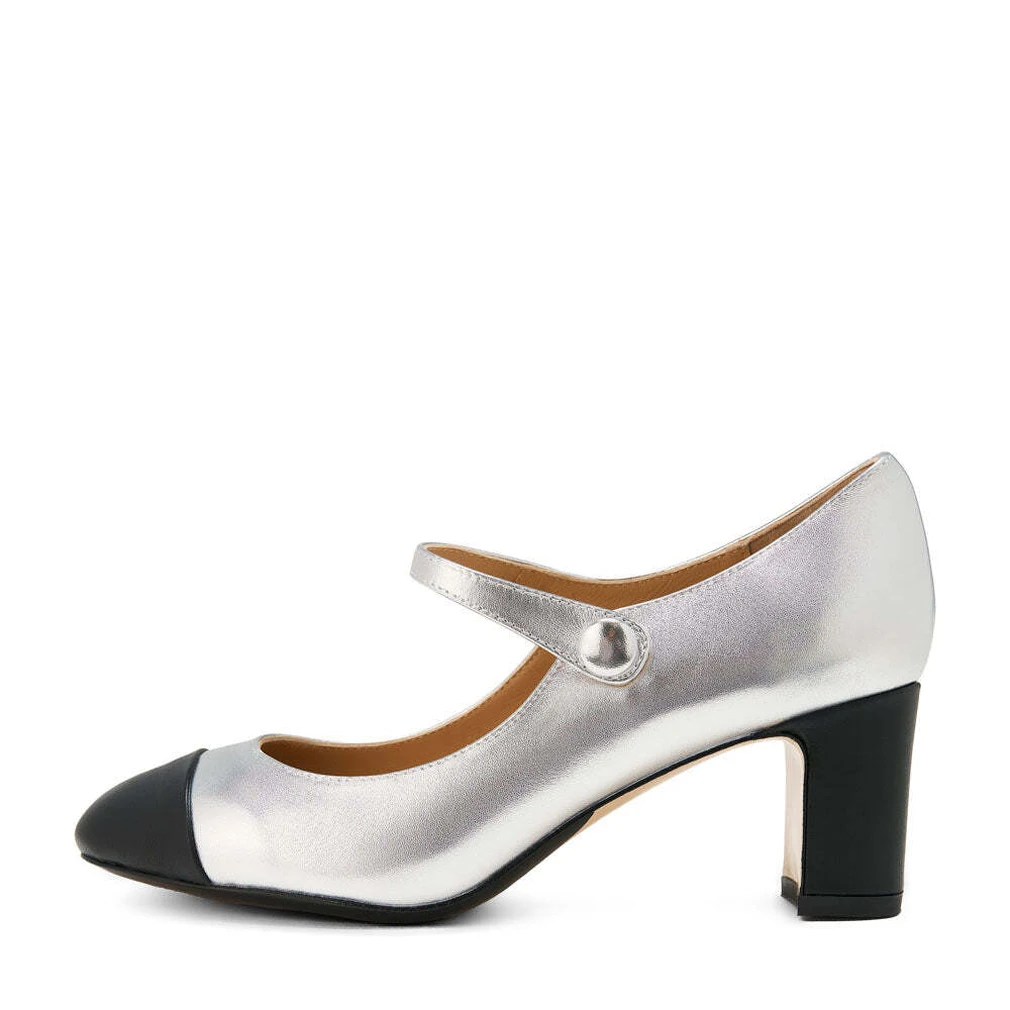 Мы давно хотели сделать модель на устойчивом каблуке в стиле ретро — и вот теперь она есть в нашей коллекции. Декоративная застежка Mary Jane c маленькой пуговкой сбоку, под которой спрятана эластичная резинка, напоминает о моде прошлого века, а чуть зауженный носик возвращает к современным трендам. Туфли Gemma из натуральной кожи серебряного цвета с контрастным черным носиком будут восхитительно смотреться с плотными черными колготками и плиссированными юбками или подчеркивающими фигуру платьями.