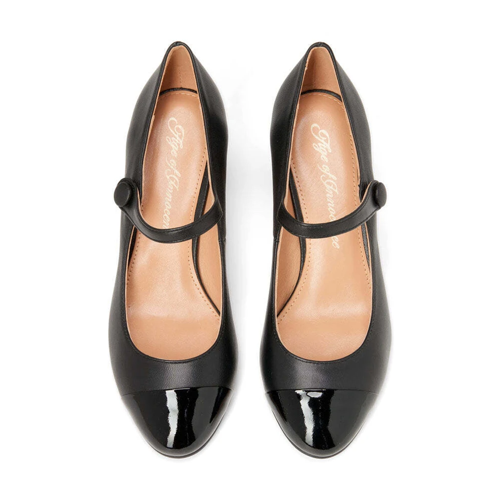 Мы давно хотели сделать модель на устойчивом каблуке в стиле ретро — и вот теперь она есть в нашей коллекции. Декоративная застежка Mary Jane c маленькой пуговкой сбоку, под которой спрятана эластичная резинка, напоминает о моде прошлого века, а чуть зауженный носик возвращает к современным трендам. Туфли Gemma из натуральной кожи чёрного цвета с контрастным лакированным черным носиком будут восхитительно смотреться с плотными черными колготками и плиссированными юбками или подчеркивающими фигуру платьями.