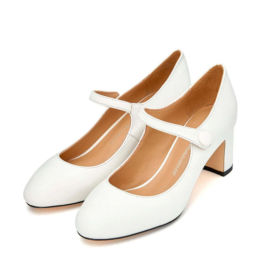 Мы давно хотели сделать модель на устойчивом, небольшом каблуке в ретро — и вот теперь она есть в нашей коллекции. Декоративная застежка Mary Jane c маленькой пуговкой сбоку, под которой спрятана эластичная резинка, напоминает о моде прошлого века, а чуть зауженный носик возвращает к современным трендам. Туфли Gemma из натуральной кожи молочного цвета будут восхитительно смотреться с летними платьями и юбками.