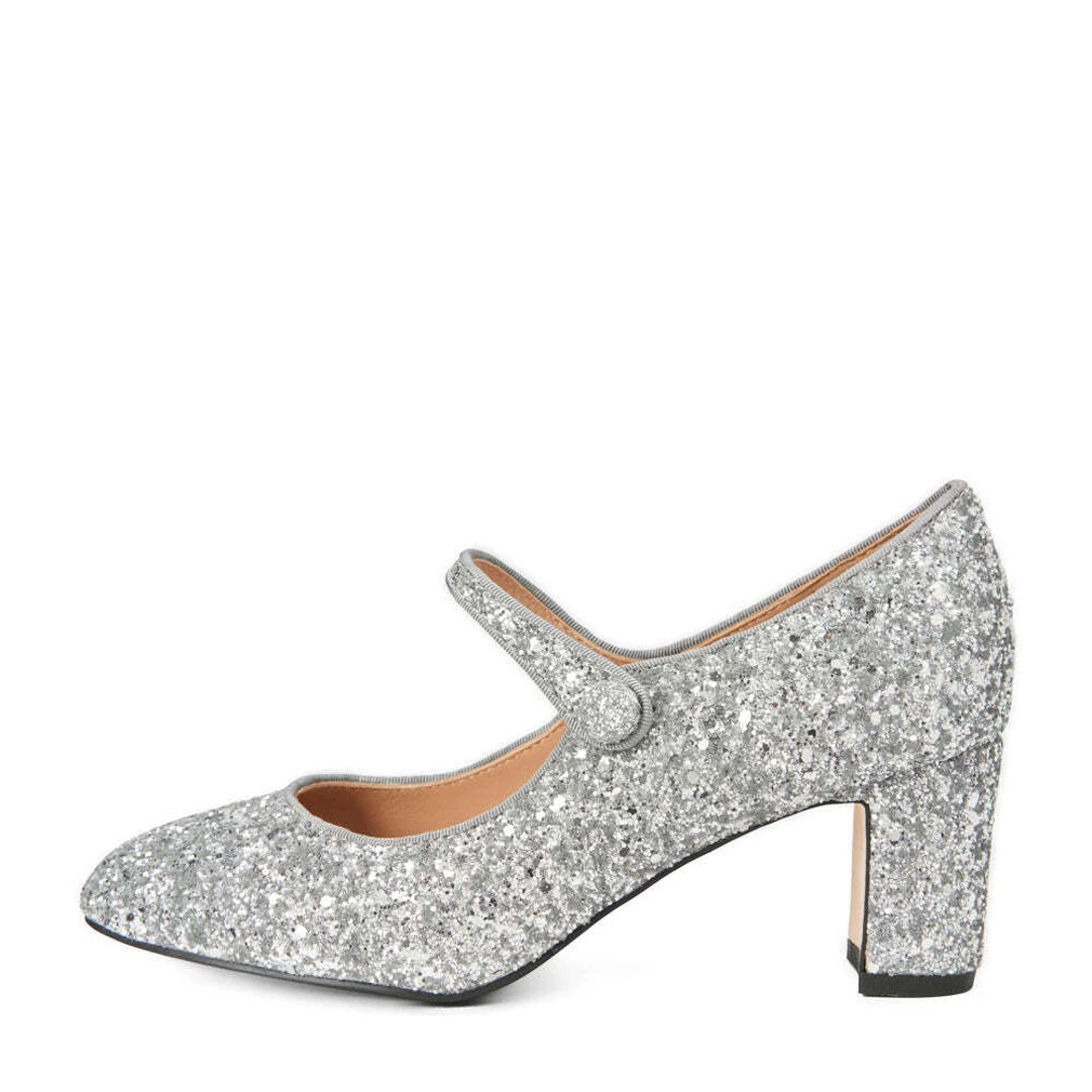 Мы давно хотели сделать модель на устойчивом, небольшом каблуке в ретро — и вот теперь она есть в нашей коллекции. Декоративная застежка Mary Jane c маленькой пуговкой сбоку, под которой спрятана эластичная резинка, напоминает о моде прошлого века, а чуть зауженный носик возвращает к современным трендам. Туфли Gemma из серебряного глиттера будут восхитительно смотреться с летними платьями и юбками.