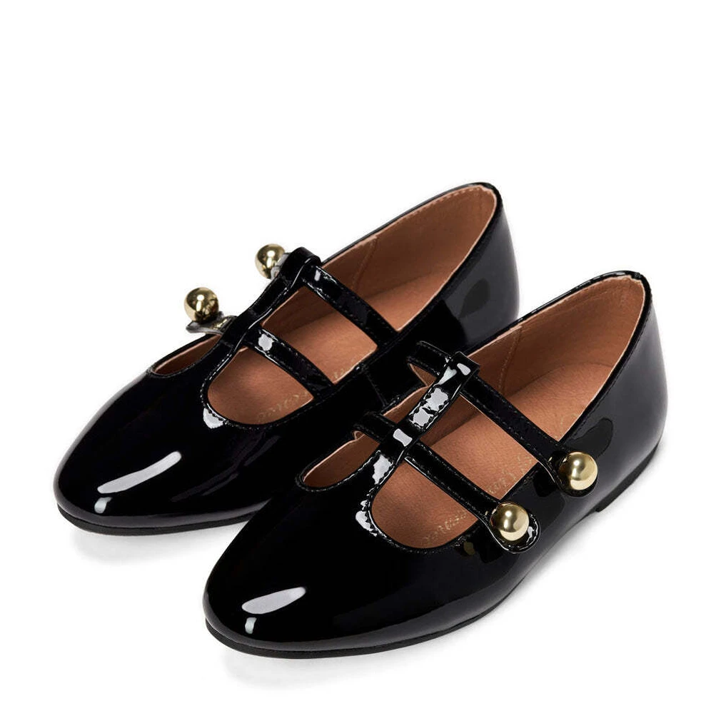 Эти элегантные лакированные туфельки Mary Jane с зауженным носиком подойдут и для особенных моментов, и для обычных школьных будней. Маленькие золотые пуговки-бусинки выполняют декоративную функцию и дополняют тонкие ремешки.