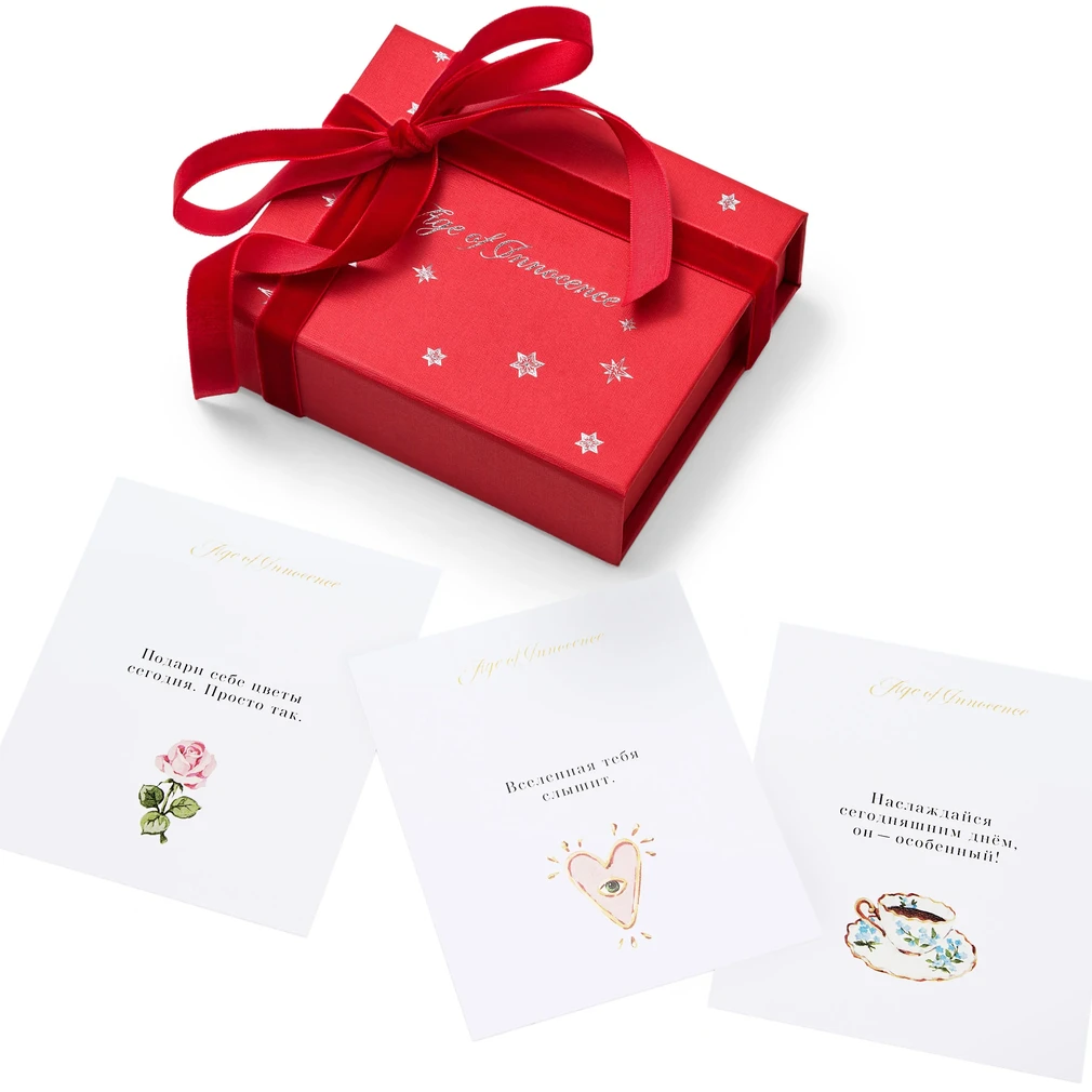 Аффирмационные карты — это короткие фразы, которые могут настроить вас на позитив, добавить веры в себя и изменить ваше эмоциональное состояние. Вы или ваши дети можете использовать их в самых разных ситуациях: вынимайте карту из колоды, создавая мотивацию на день, кладите или вешайте ее на видное место, возвращайтесь к ним в течение дня, находя важные и нужные для вас слова. Каждый подарочный сертификат Age of Innocence наполнен самыми тёплыми эмоциями, и в каждом вы найдёте 30-ую карту с сертификатом на покупку любимой пары туфель.
