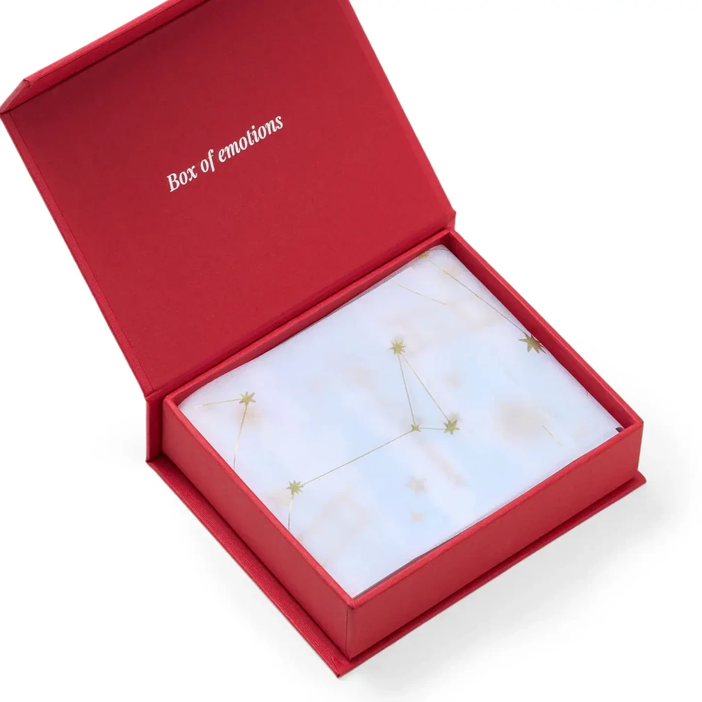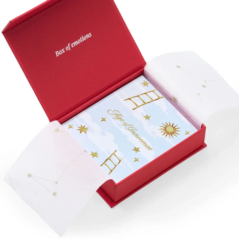 В новогодней коробке, перевязанной бархатной лентой, упакованный в тонкую белую бумагу с золотыми звёздами, лежит сертификат на выбранную вами сумму. Но помимо подарочного сертификата, в нашей коробочке вы также найдёте 29 карт с аффирмациями.