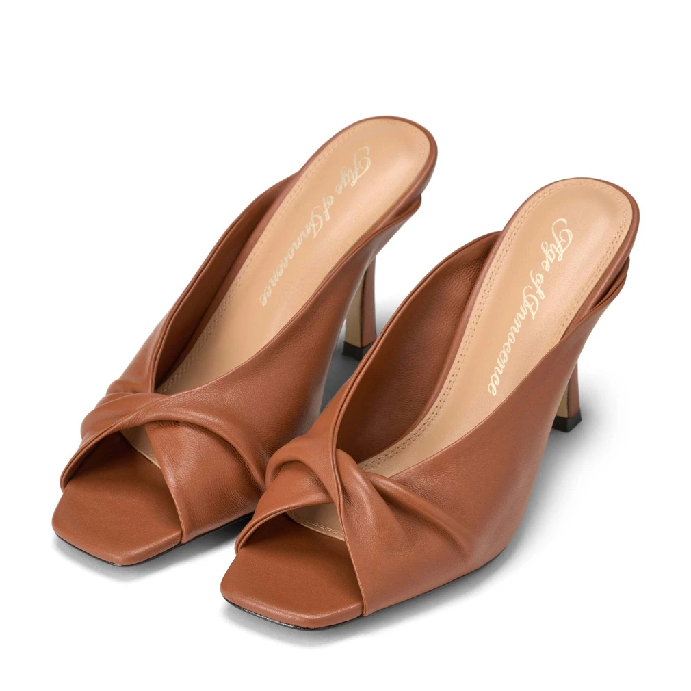 Кожаные мюли Patti с открытым мысом украшает изящный бант — эта деталь добавляет модели особый шарм. Необычный силуэт создаётся за счёт глубокого выреза, открывающего пальцы, квадратного носка и элегантного каблука высотой 9 см. Эти мюли прекрасно сочетаются с летними капри и воздушными макси-платьями, особенно с эффектным педикюром.