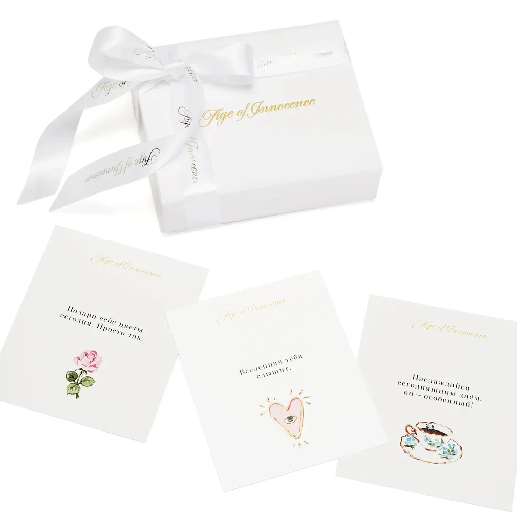 Аффирмационные карты — это короткие фразы, которые могут настроить вас на позитив, добавить веры в себя и изменить ваше эмоциональное состояние. Вы или ваши дети можете использовать их в самых разных ситуациях: вынимайте карту из колоды, создавая мотивацию на день, кладите или вешайте ее на видное место, возвращайтесь к ним в течение дня, находя важные и нужные для вас слова. Каждый подарочный сертификат Age of Innocence наполнен самыми тёплыми эмоциями, и в каждом вы найдёте 30-ую карту с сертификатом на покупку любимой пары туфель.