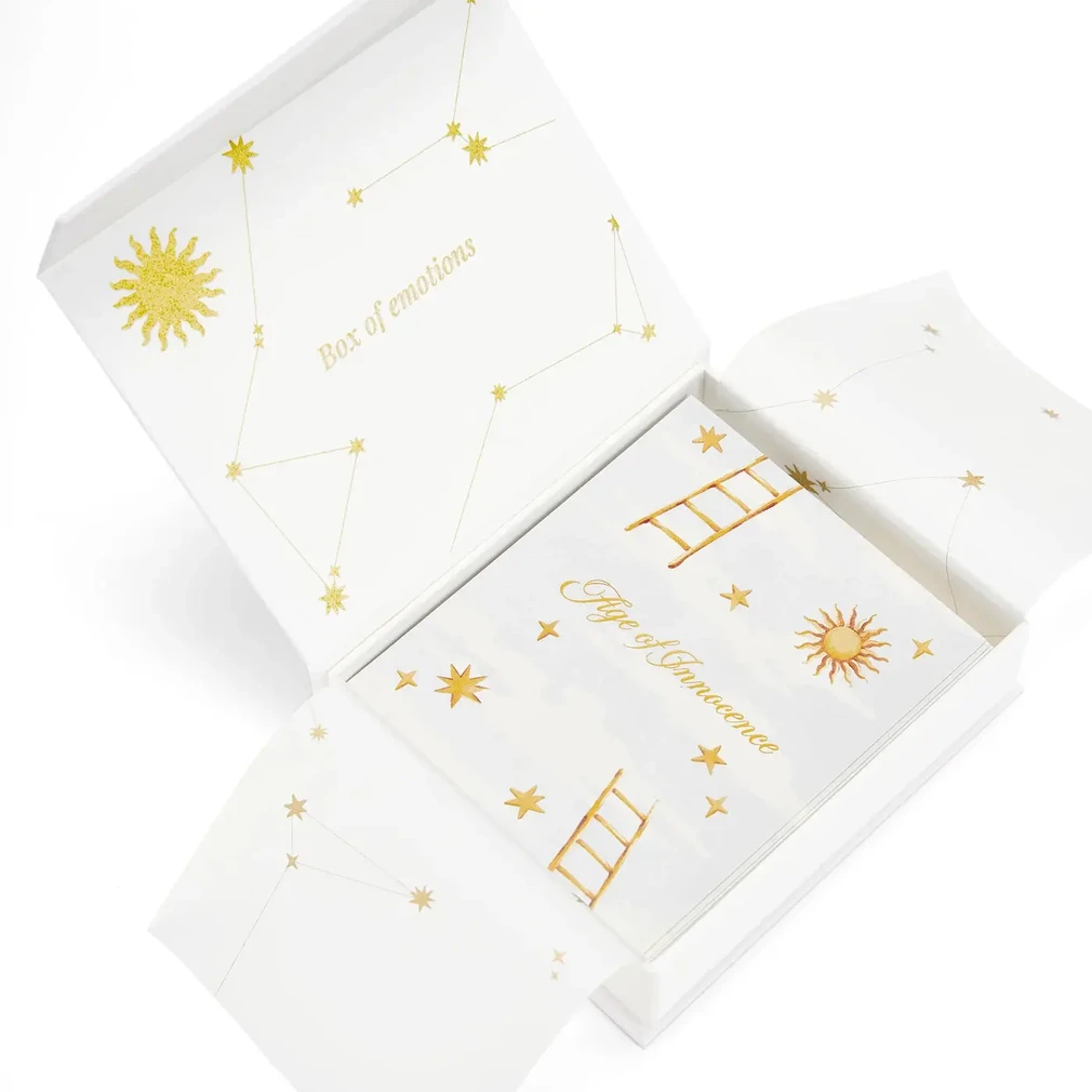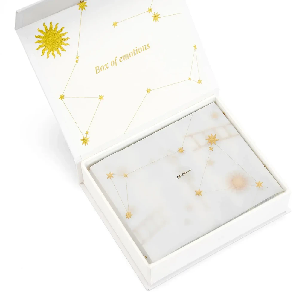 В белоснежной коробке, перевязанной шелковой лентой, упакованный в тонкую белую бумагу с золотыми звёздами, лежит сертификат на выбранную вами сумму. Но помимо подарочного сертификата, в нашей коробочке вы также найдёте 29 карт с аффирмациями.