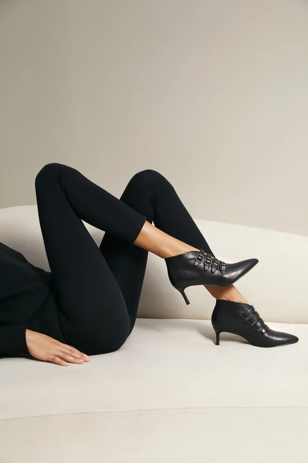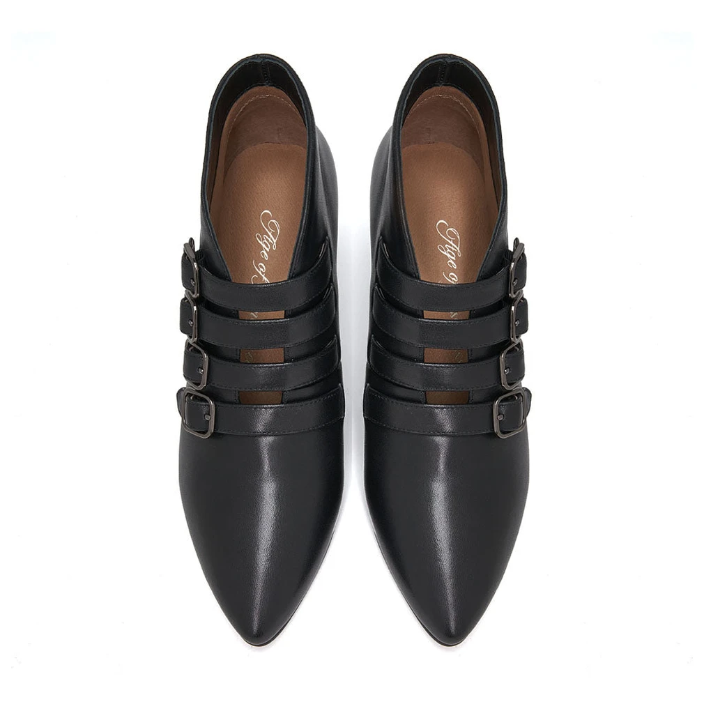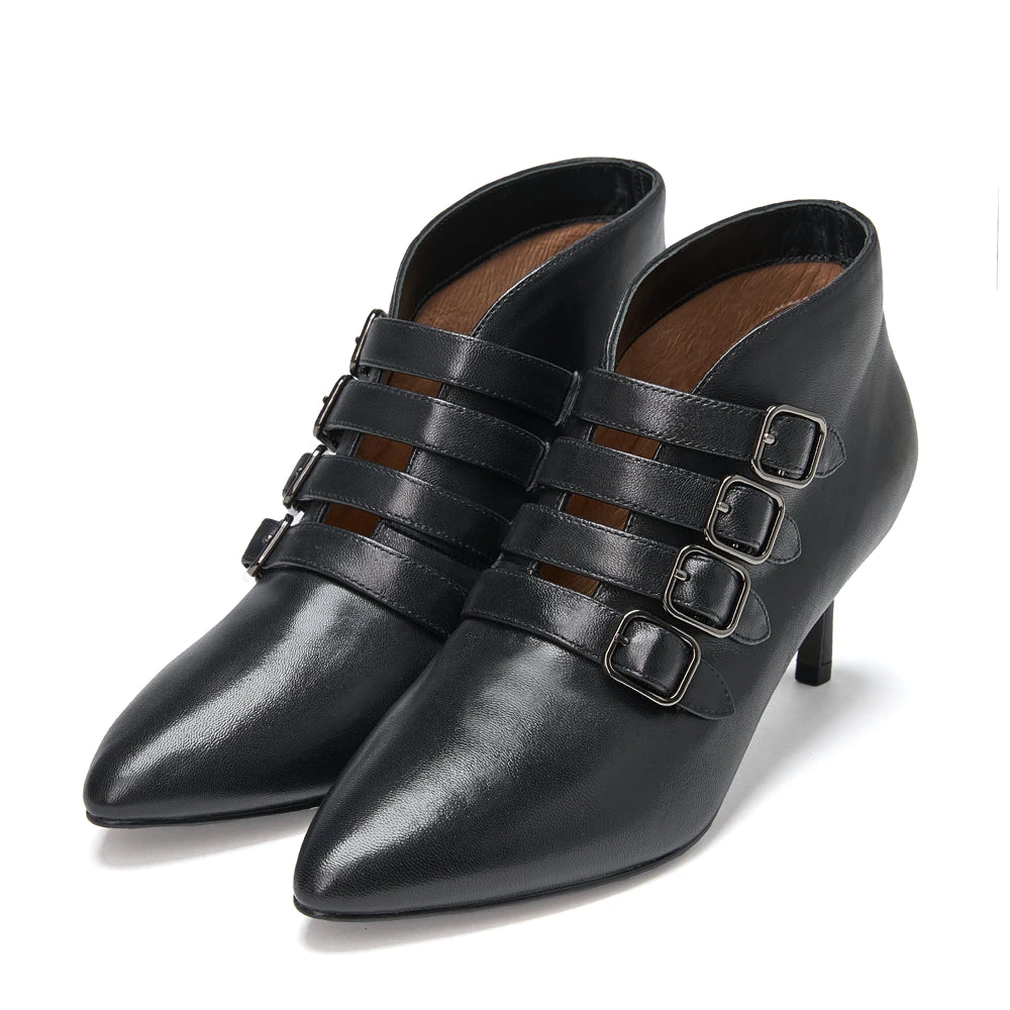 Стиль этих ботильонов можно было бы охарактеризовать как элегантный вестерн. Кожаные ботиночки на каблуках с удлинённым носом и четырьмя декоративными ремешками с металлическими пряжками смотрятся достаточно эксцентрично для того, чтобы приковывать взгляды. Носите их и с брюками, и с платьями, не бойтесь миксовать стили и расставлять те или иные акценты в зависимости вашего настроения.