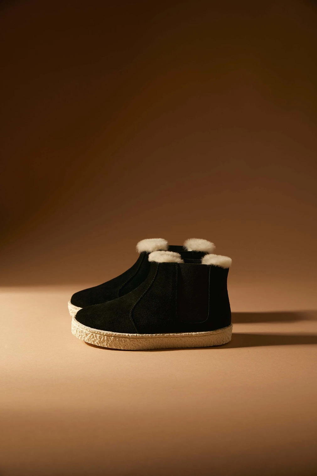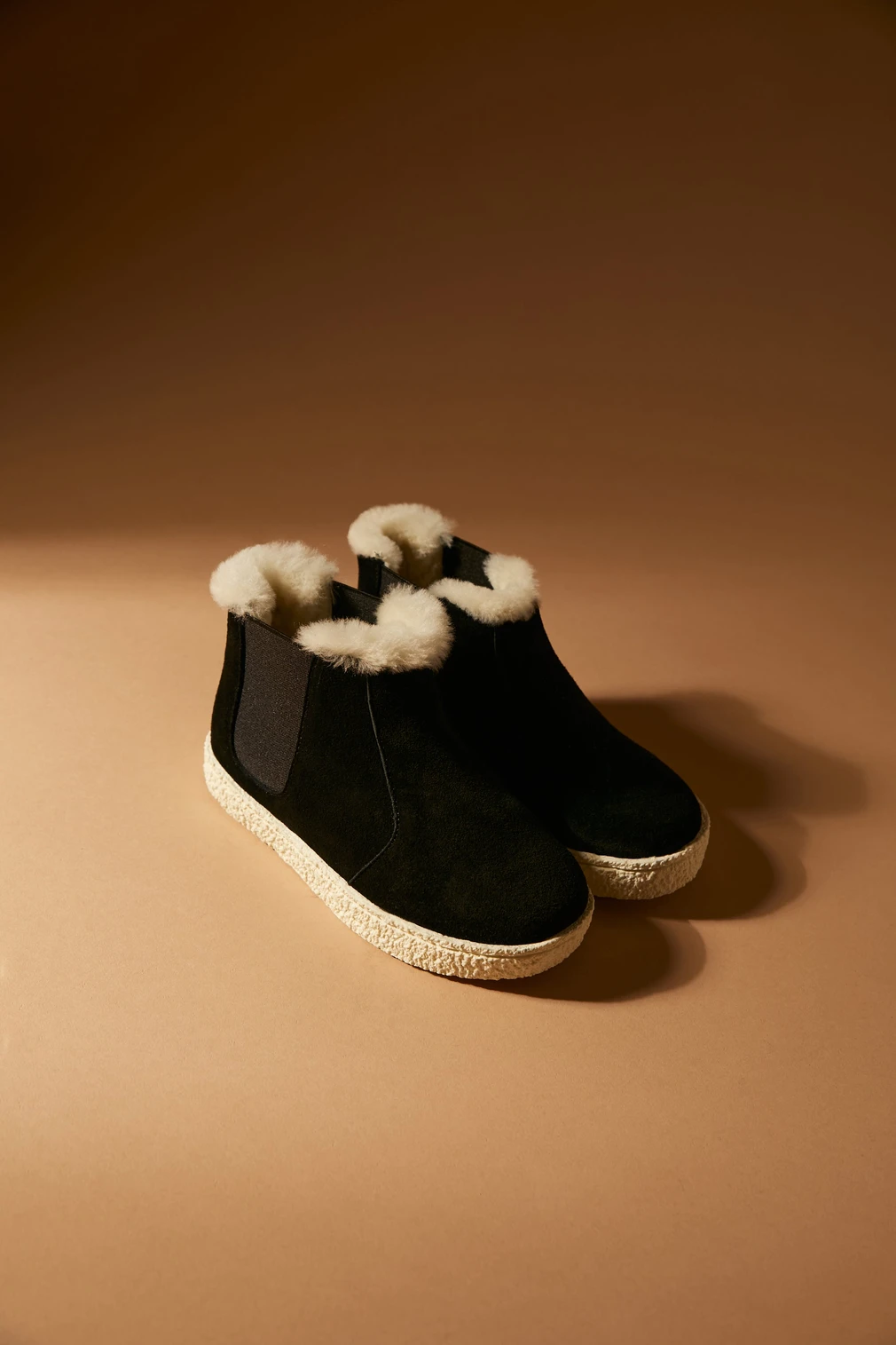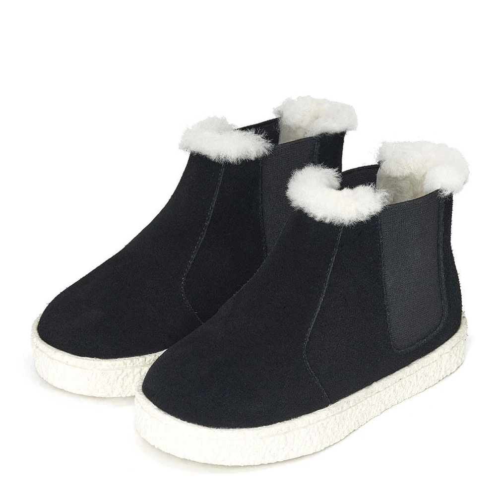 Эти очень теплые и удобные ботиночки из замши с натуральным белоснежным мехом внутри и высокой резиновой подошвой — лучшее, что можно придумать для холодной и снежной зимы. Носите их с джинсами и шерстяными юбками и наслаждайтесь долгими прогулками.