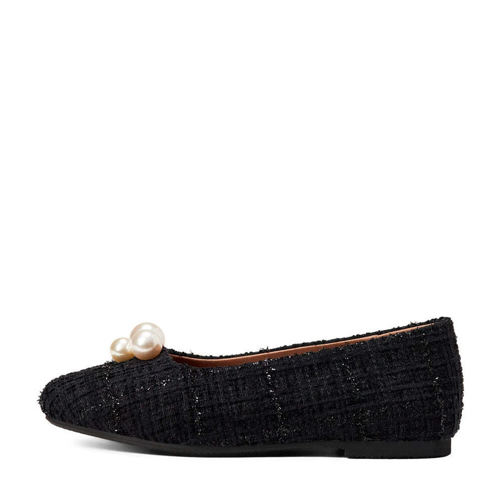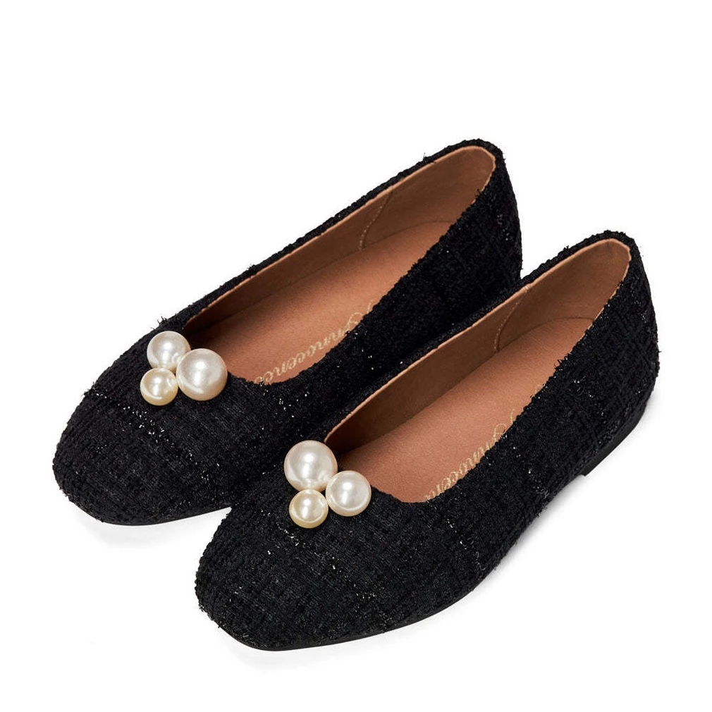 Эти чёрные твидовые балетки с небольшими декоративными жемчужинками влюбили нас в себя с самого первого взгляда. Аккуратный, чуть удлиненный, но квадратный носик повторяет вырез самой туфельки. Эта модель создана для самых важных моментов — от школьного концерта до первого похода в Большой.
