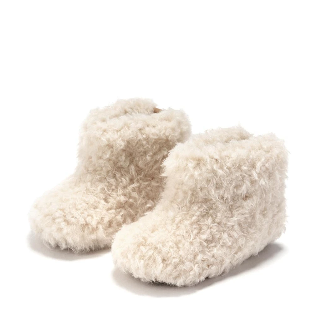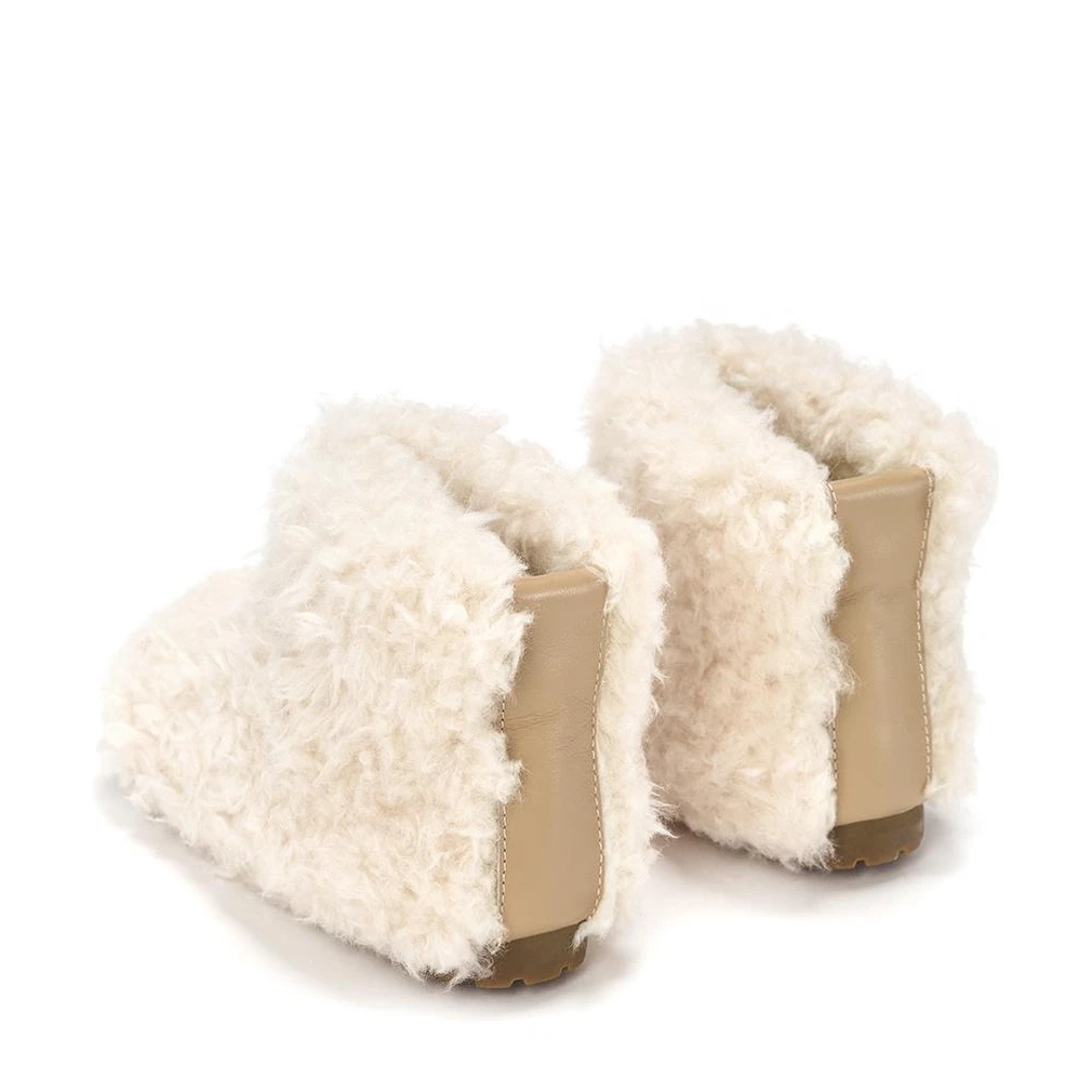 Сапожки Yeti Mini выполнены из пушистого искусственного меха молочного цвета. Подкладка и стелька изготовлены из натуральной коротковорсовой шерсти, которая прекрасно держит тепло. Сапожки легкие и теплые. Прекрасно сочетаются с теплыми легинсами, свитером и объемной паркой. Если вы планируете поездку в гору — это незаменимый предмет гардероба для аprès-ski.